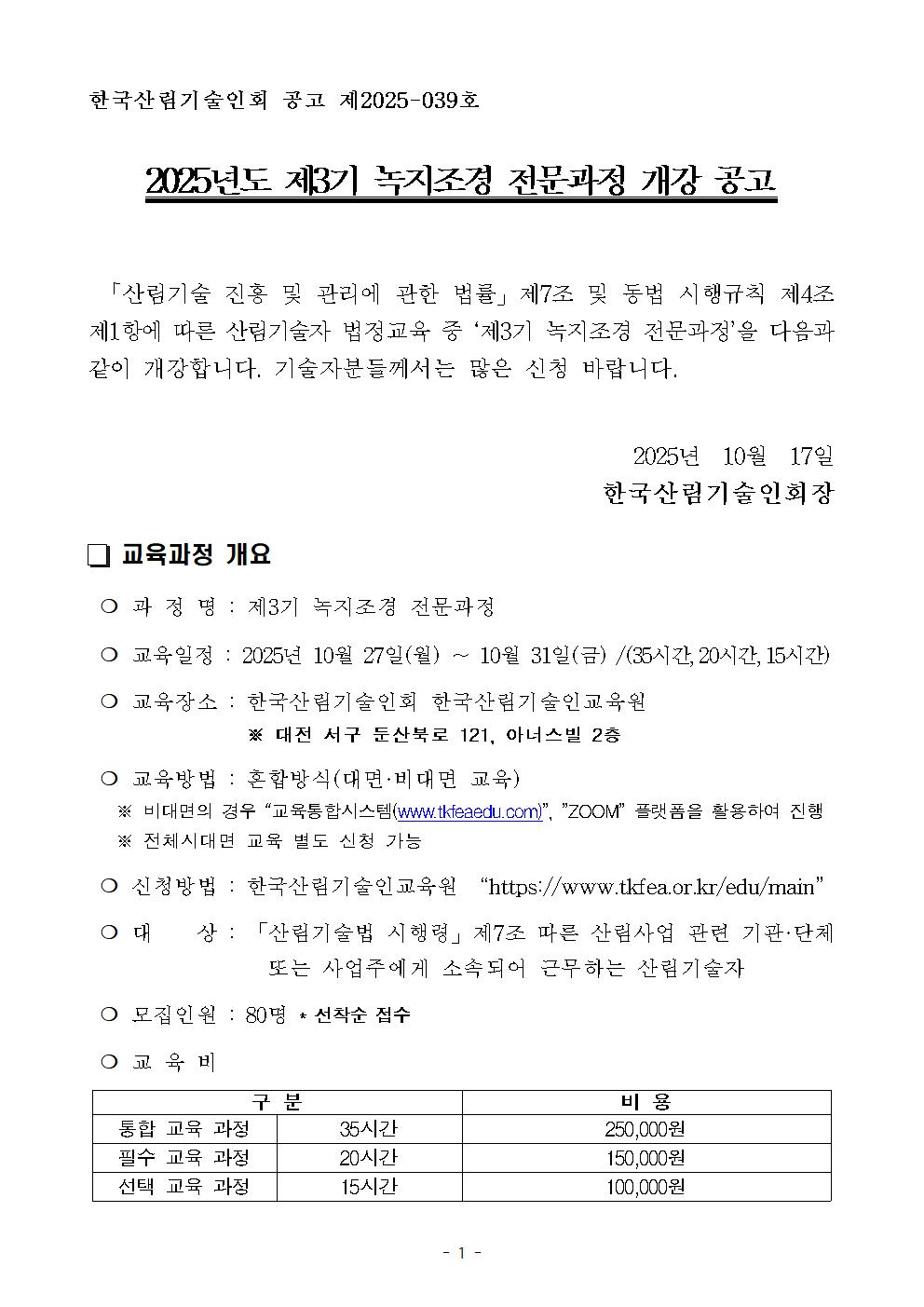 [제2025-039호] 제3기녹지조경 전문과정 개강 공고
