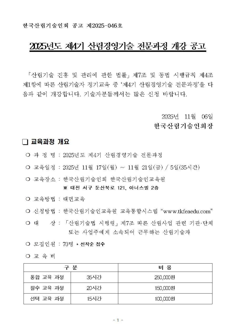 [제2025-046호] 제4기 산림경영기술과정 개강 공고