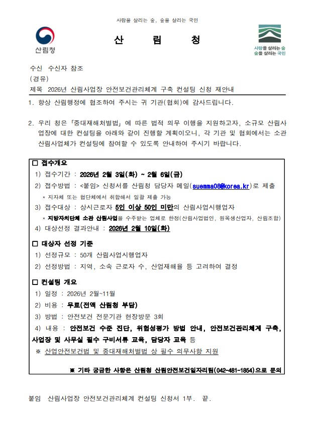 26년도 산림사업장 안전보건 관리체게 구축 컨설팅 신청 안내 관련 상세 사항은 붙임 2.을 참고하여 주시고 신청하고자 하는 산림사업시행업자는 붙임 3을 작성하여