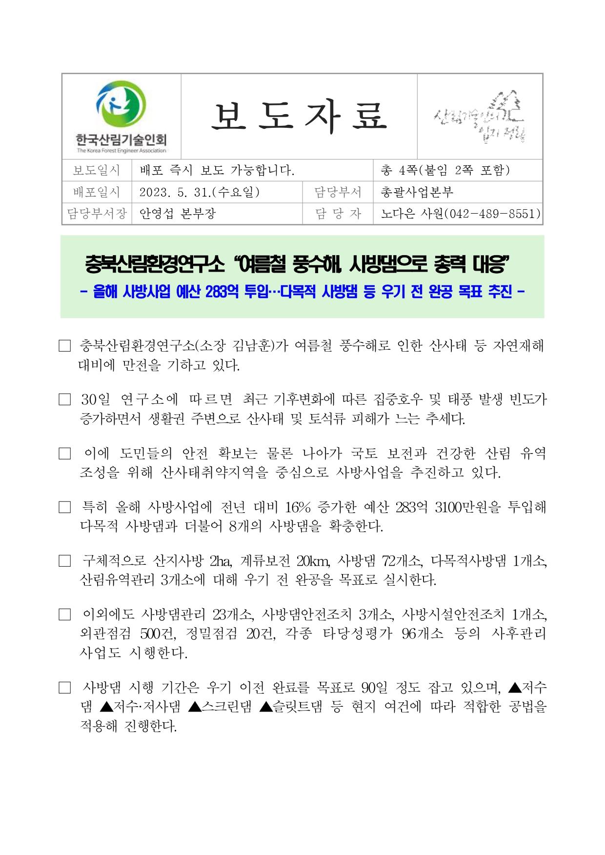 □ 충북산림환경연구소(소장 김남훈)가 여름철 풍수해로 인한 산사태 등 자연재해 대비에 만전을 기하고 있다.