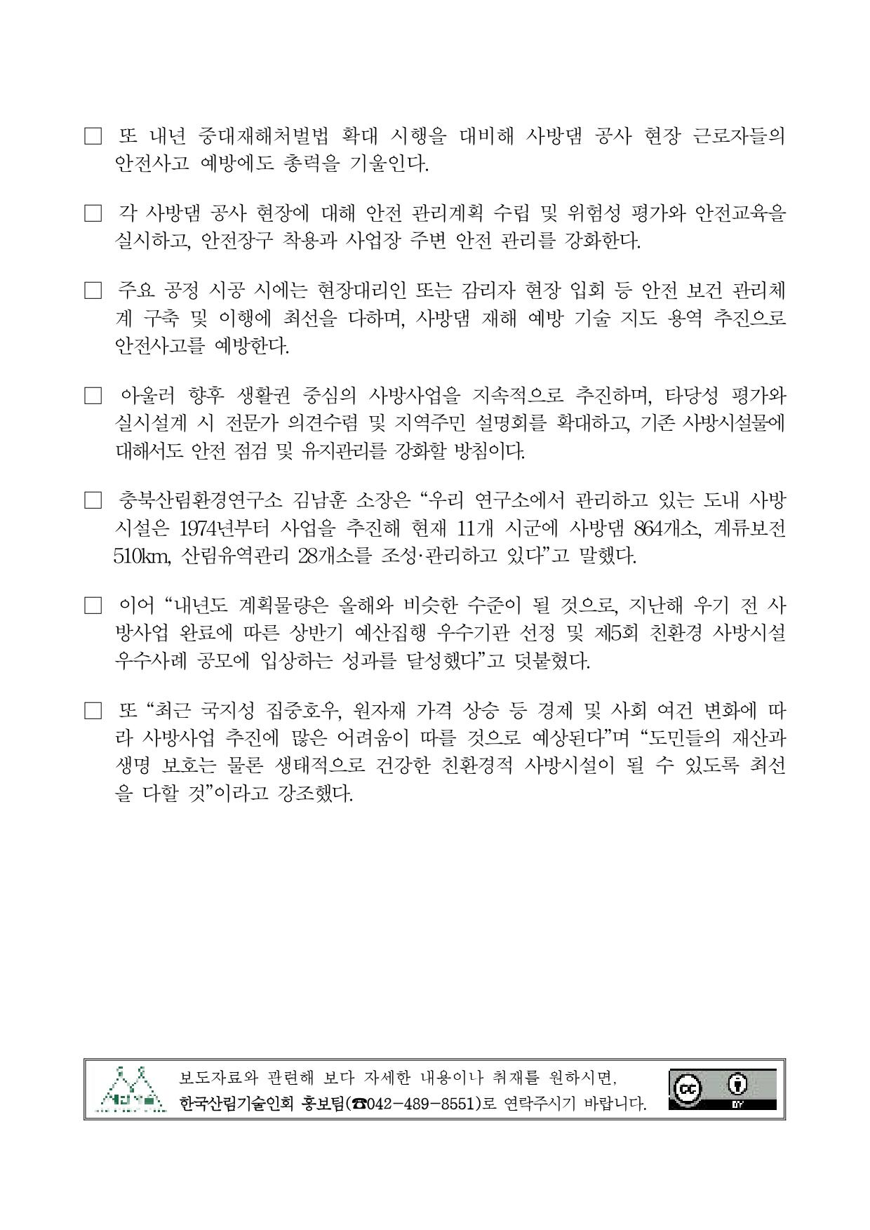 □ 또 내년 중대재해처벌법 확대 시행을 대비해 사방댐 공사 현장 근로자들의 안전사고 예방에도 총력을 기울인다.
